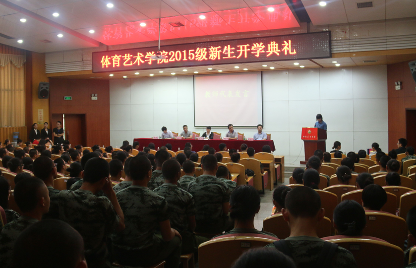 2015年9月14日下午14:30在八教学海厅,体育艺术学院组织召开了2015级新生开学典礼。会议由体育艺术院党委副书记邵华主持,出席会议的领导有院长李骅、党委书记罗喜安、副院长盛红彪、副院长曹庆荣,还有学院各系主任、班主任、学工组老师以及2015级全体新生和助班。