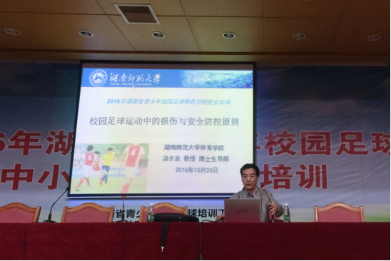 2016年 10月20日上午8点30分,湖南师范大学yl88858永利集团博士生导师汤长发教授于第八教学楼学海厅做主题为“足球运动安全风险的防控与处置”的课程培训。湖南省中学校园足球特色学校全体校长参加了此次培训。