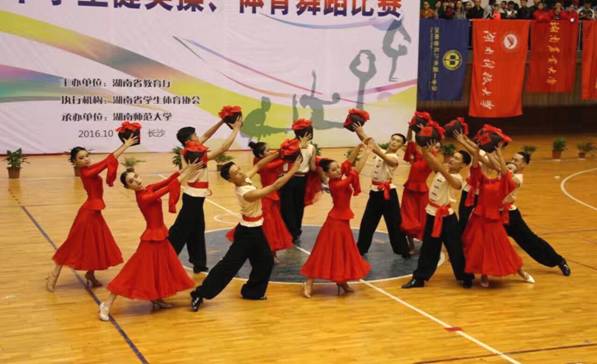 由湖南省教育厅主办的2016年湖南省大中学生健美操、体育舞蹈比赛于10月27日-30日在湖南师范大学举行。在学校和学院的大力支持下,在学院表演系周平、周振乾、徐欣、何伟兴四位老师的带领下组建了43名运动员的学校代表队参加了本次比赛。