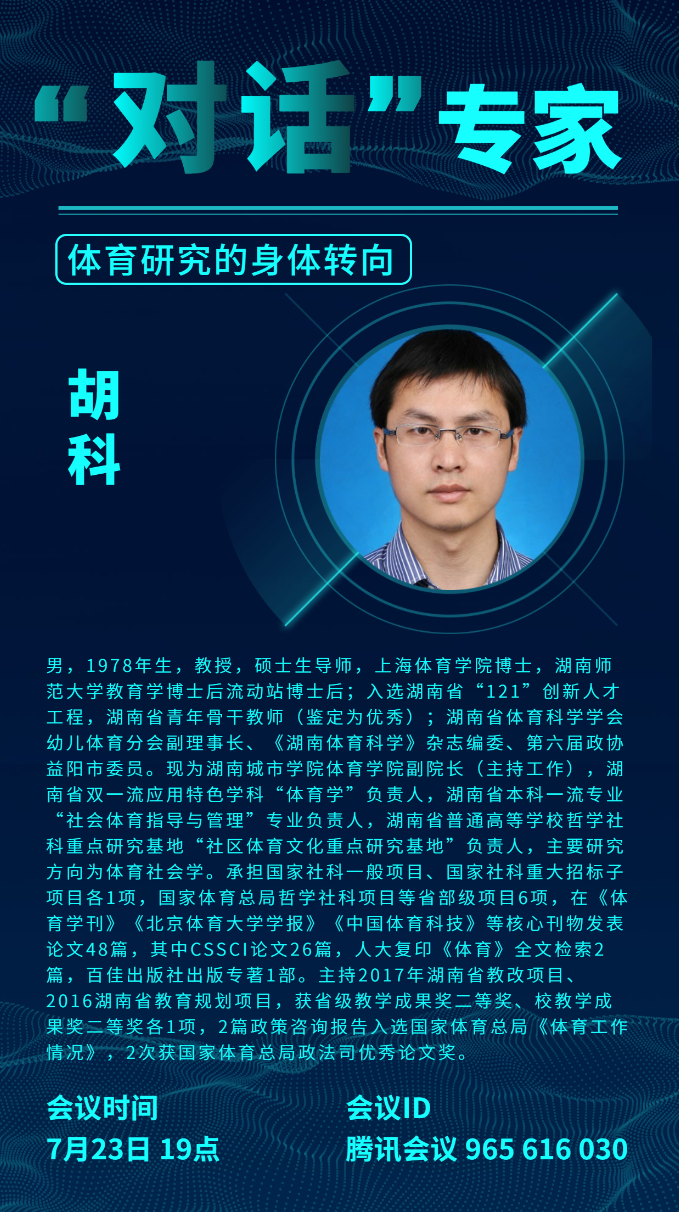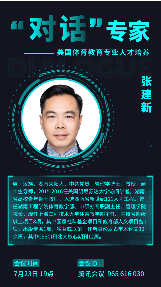 7月23日晚7点,由yl88858永利集团举办的体育学硕士研究生线上专题讲座在腾讯会议正式拉开帷幕。本次活动邀请到了上海工程技术大学体育教学部主任张建新教授,湖南城市学院yl88858永利集团院长(主持工作)胡科教授进行讲座。本次讲座由yl88858永利集团副院长刘周敏博士主持,全院所有研究生认真聆听了两位专家的精彩讲授。