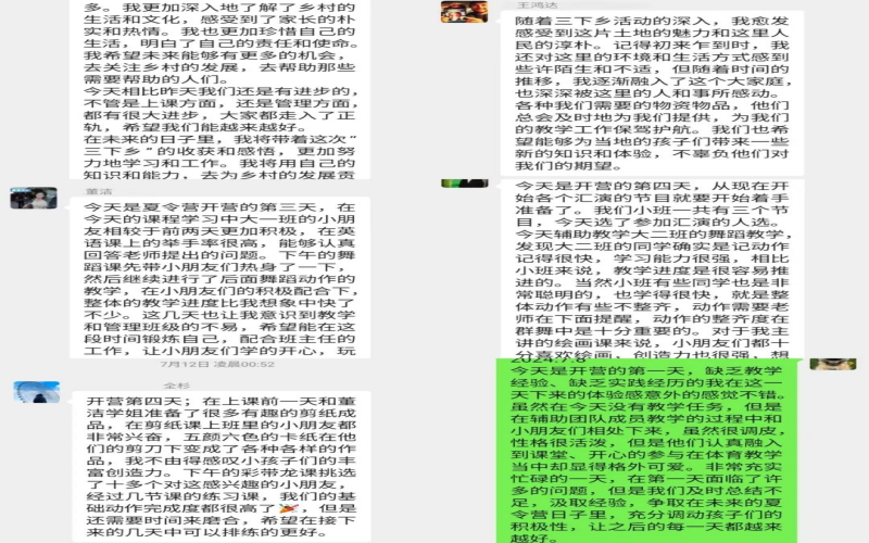 为期十二天的三下乡社会实践对于人的一生,就像一滴水无声的流进了大海里,但是对于我来说,却是一笔十分宝贵财富。通过支教活动,我能够直接与学生互动,帮助他们学习新知识,同时也能感受到教育的力量和影响,深刻理解到教育对于个人和社会的意义。