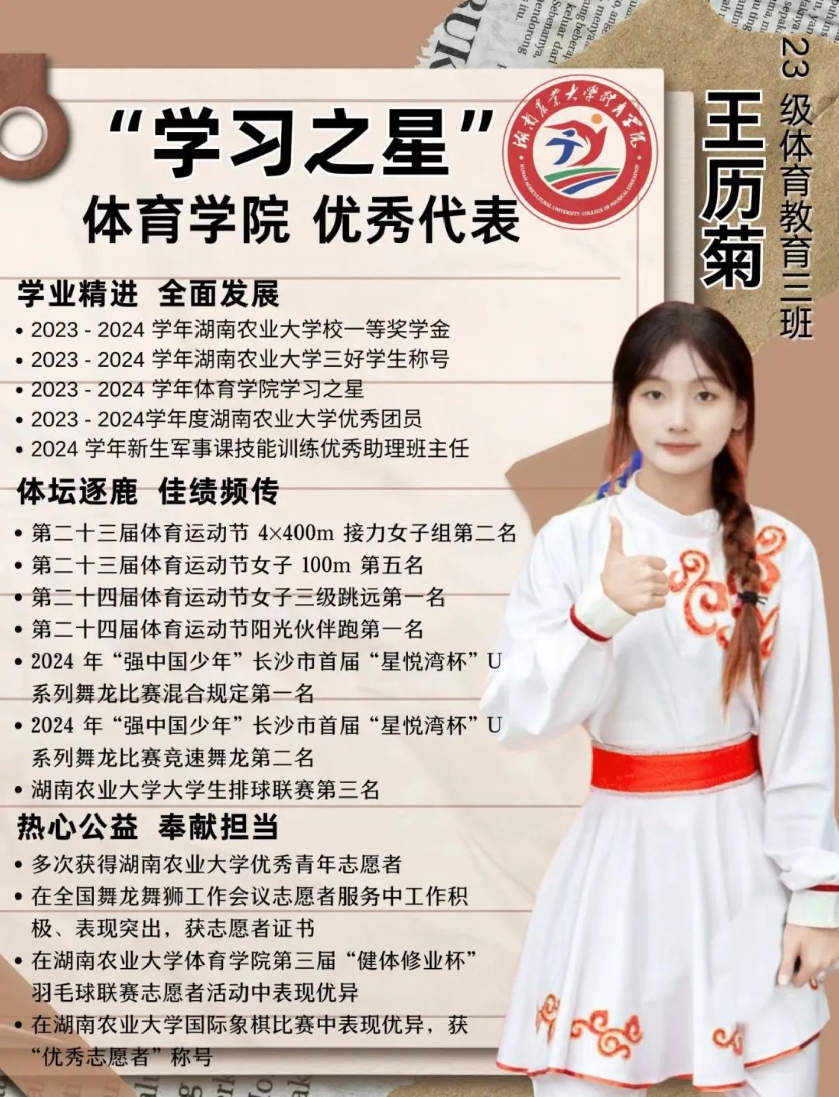 全面发展,塑造自我。综合素质方面,她注重自身综合素质的培养,不仅在学业上取得优异成绩,还积极发展自己的兴趣爱好。她参加湖南农业大学舞龙队,感受传统艺术的魅力。同时,也喜欢运动,经常参加学校的体育活动,如校运会、排球比赛等,拥有健康的体魄和积极向上的生活态度。她追求卓越,无违纪行为,在实践的大舞台不断历练,提升自己。
