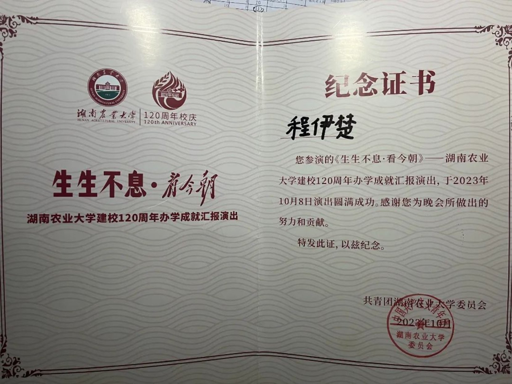 暑期积极参加三下乡社会实践,组建湖南农业大学“艺韵传承、关爱同行”实践队进行实地调研和相关教学任务;担任2023级新生助班,参与2023级新生迎新志愿活动;在“三清校园”主题征文比赛中荣获优秀奖;志愿参加“商梦璀璨,薪火相传”迎新晚会;连续两年参加学校体育运动节广播体操比赛,皆获一等奖。