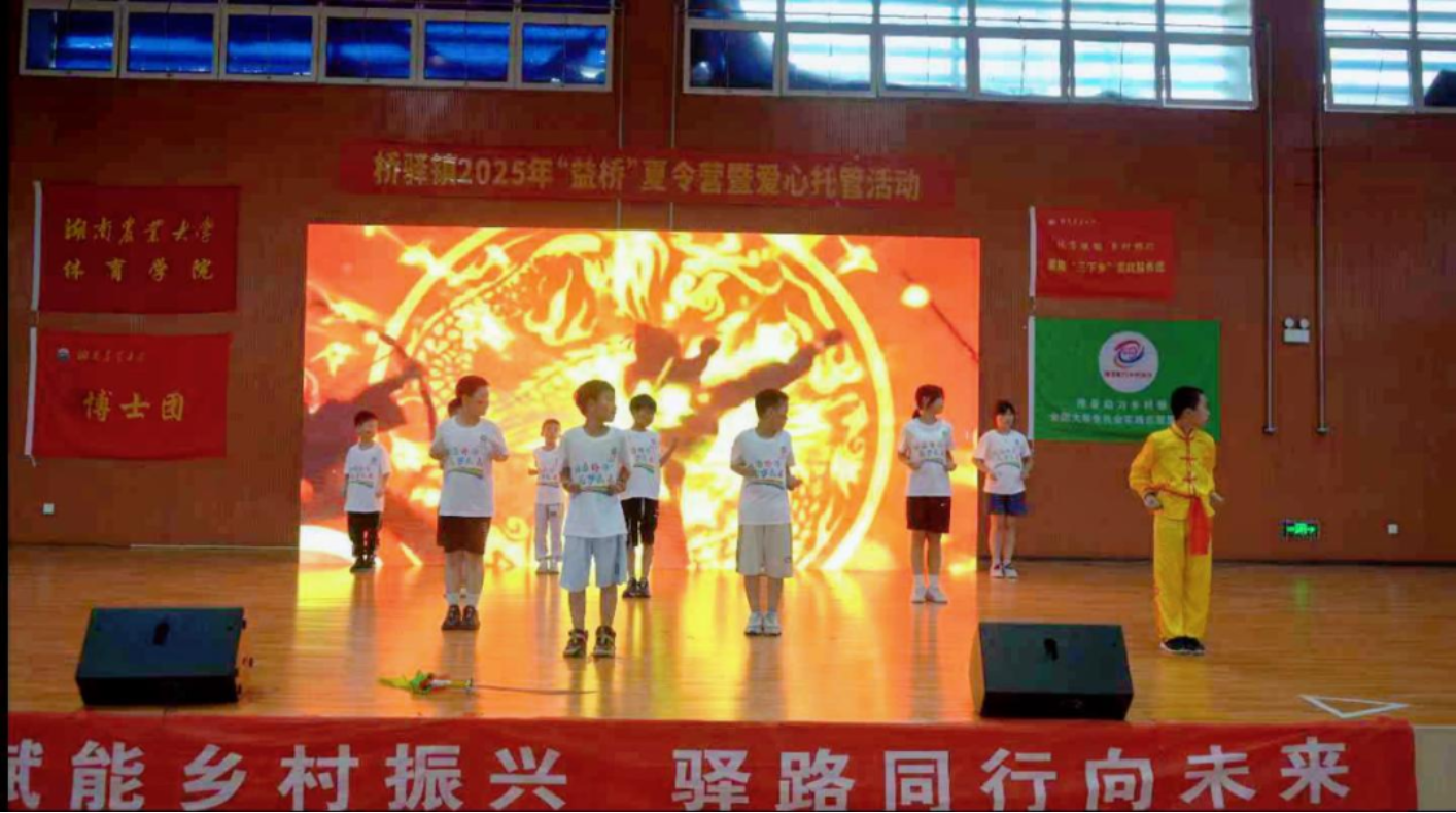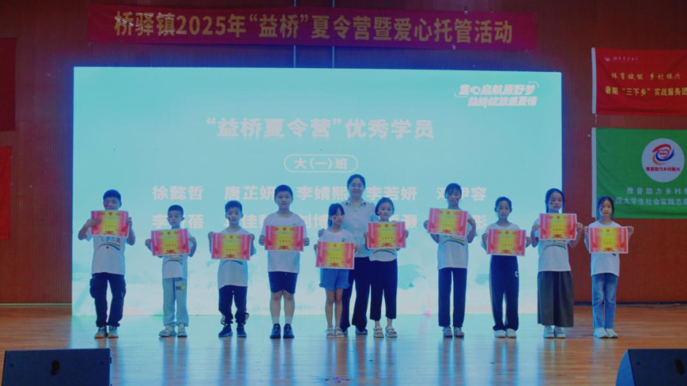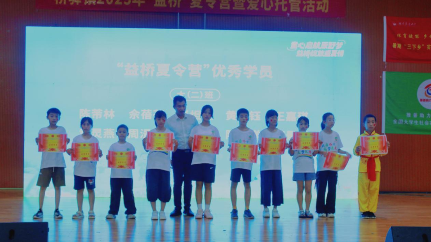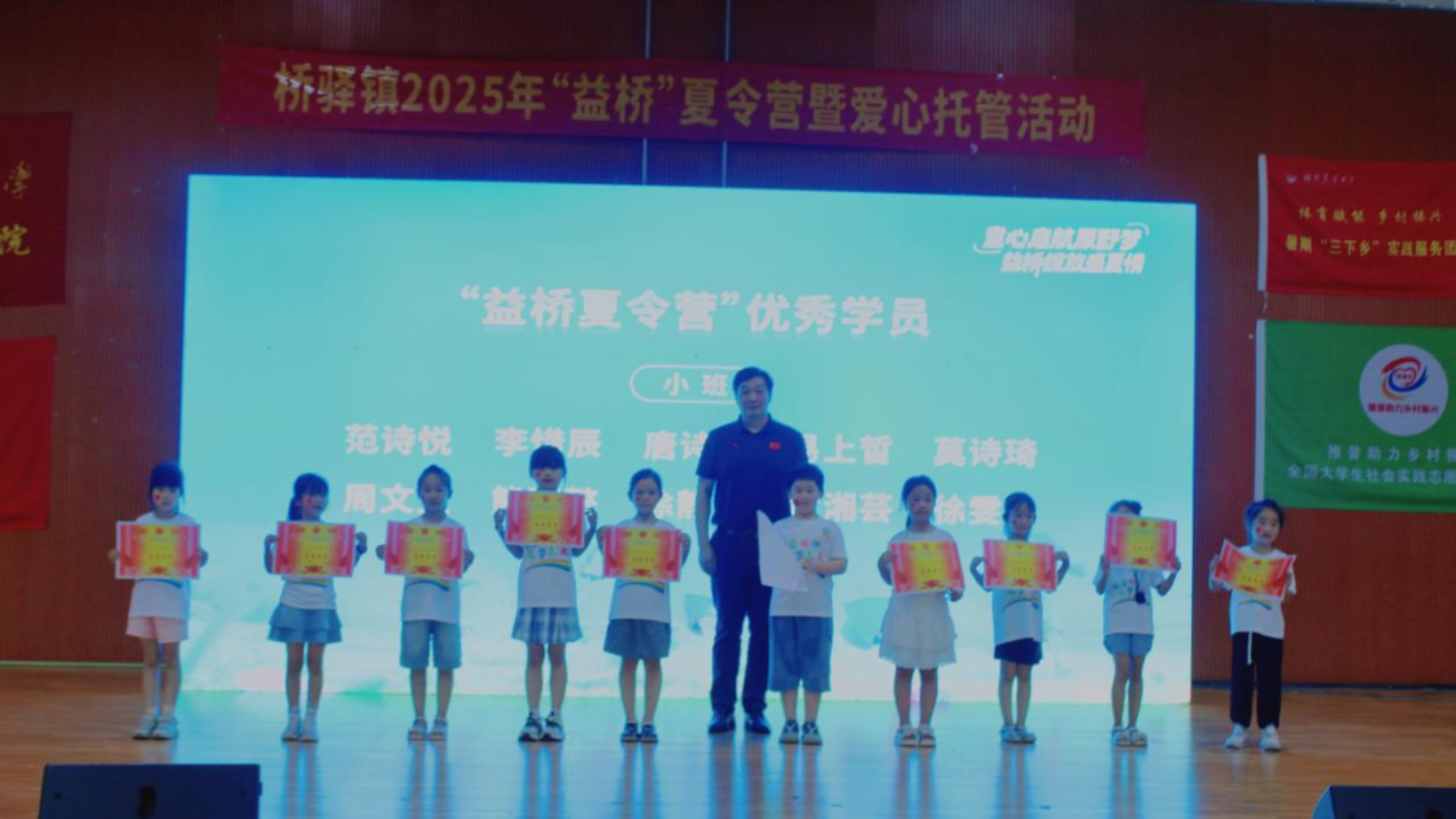 (供稿人:王历菊)7月18日下午,“童心启航原野梦 益桥绽放盛夏情”桥驿镇2025年“益桥”夏令营暨爱心托管活动结营仪式在桥驿中学体艺馆二楼隆重举行。yl88858永利集团副院长熊少波,桥驿镇人大副主席、镇团委书记谭紫璐、桥驿中学副校长李斯、yl88858永利集团学工办主任欧明旭、团委书记周霞出席,全体大学生志愿者、桥驿镇返乡大学生志愿者、夏令营全体学员及家长参加本次结营仪式。仪式由李欣如、周兴尧主持。