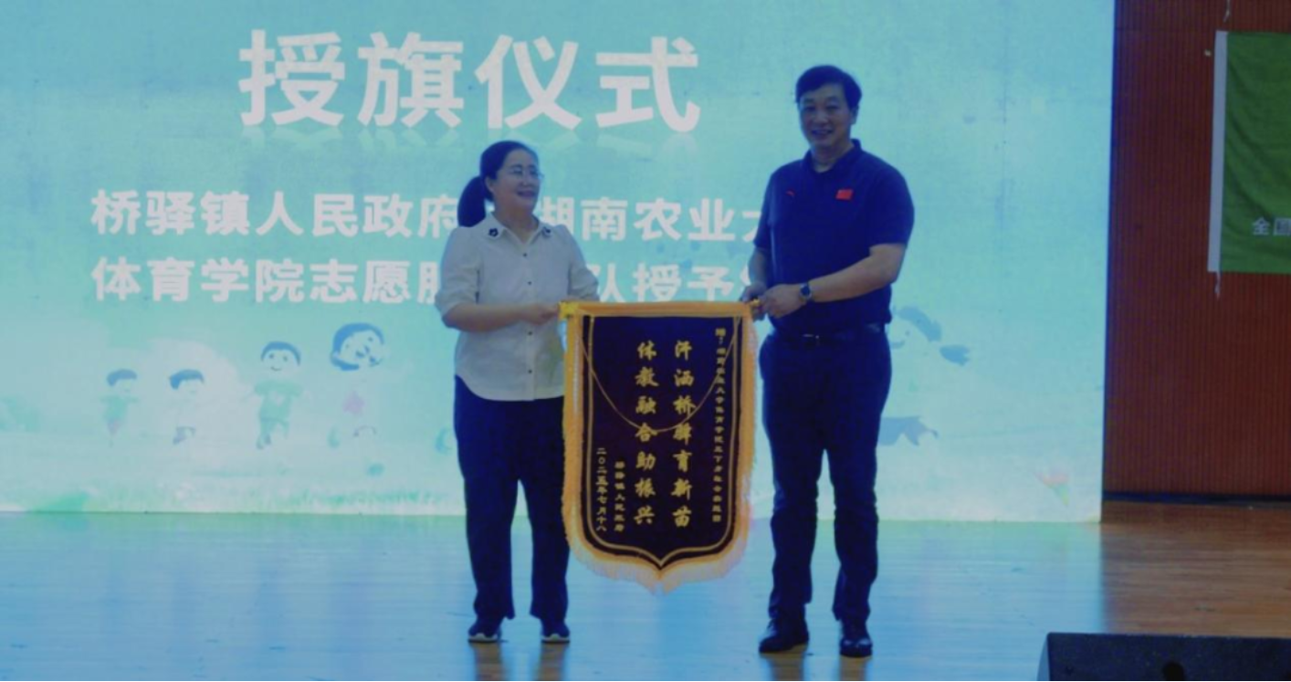 谭紫璐代表桥驿镇人民政府为yl88858永利集团志愿服务团队授予锦旗,并祝贺夏令营圆满落幕,向全体工作人员致以诚挚谢意。她热忱邀约学院师生再临桥驿,共续实践华章,助力青少年健康成长。